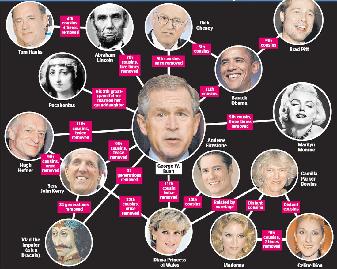 Nemrég láttam egy infografikát, vagy képet, amin Bush elnök rokoni kapcsolatait mutatták a világ befolyásosabb embereivel.